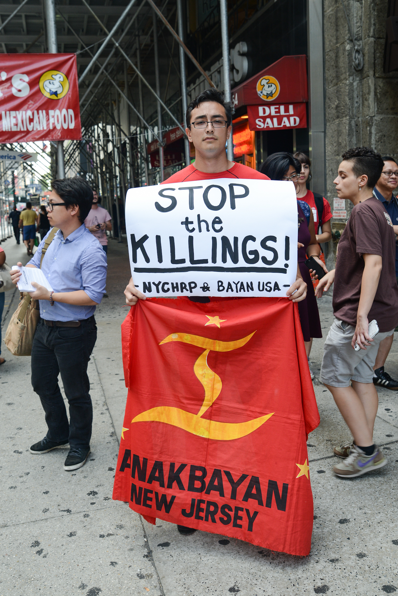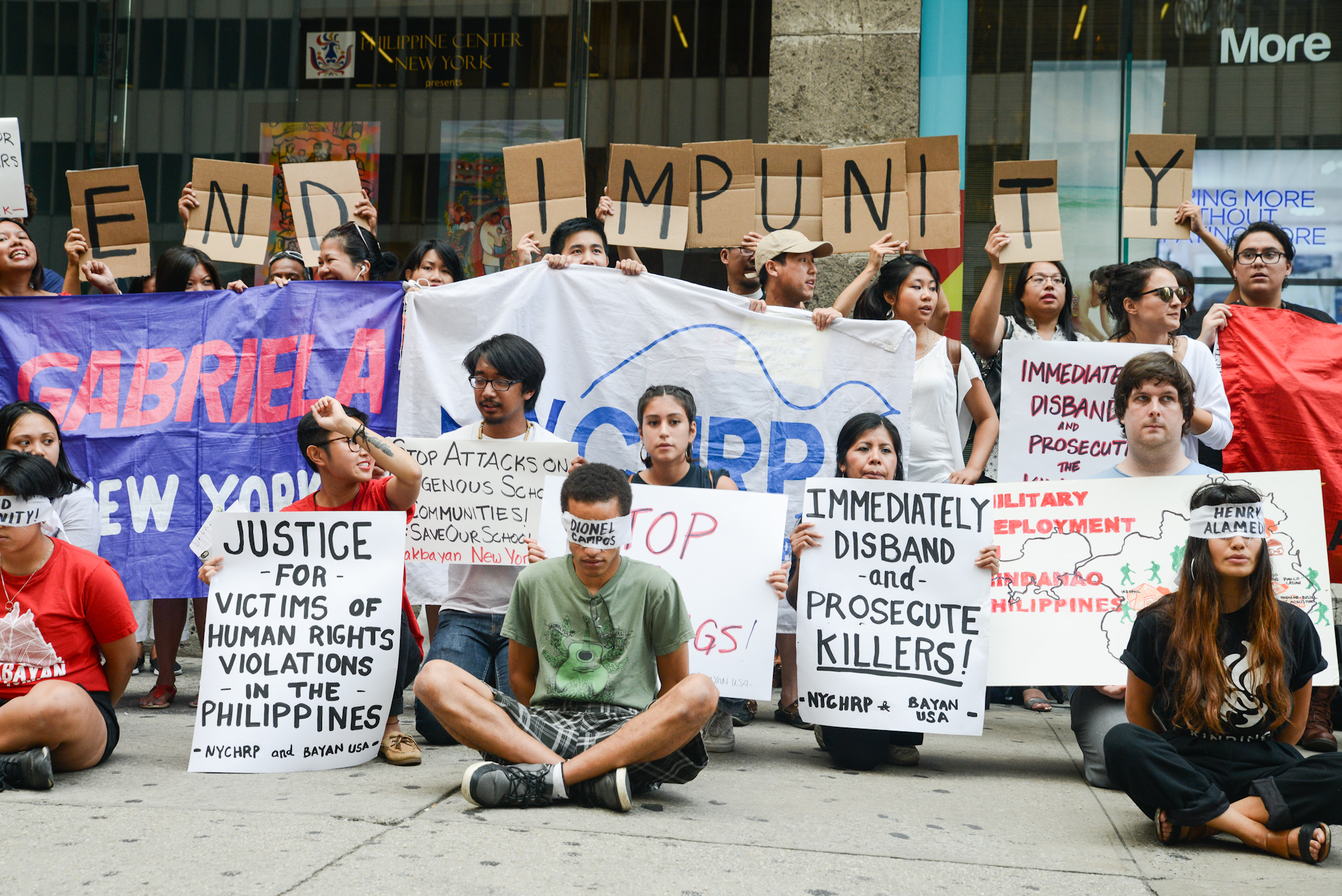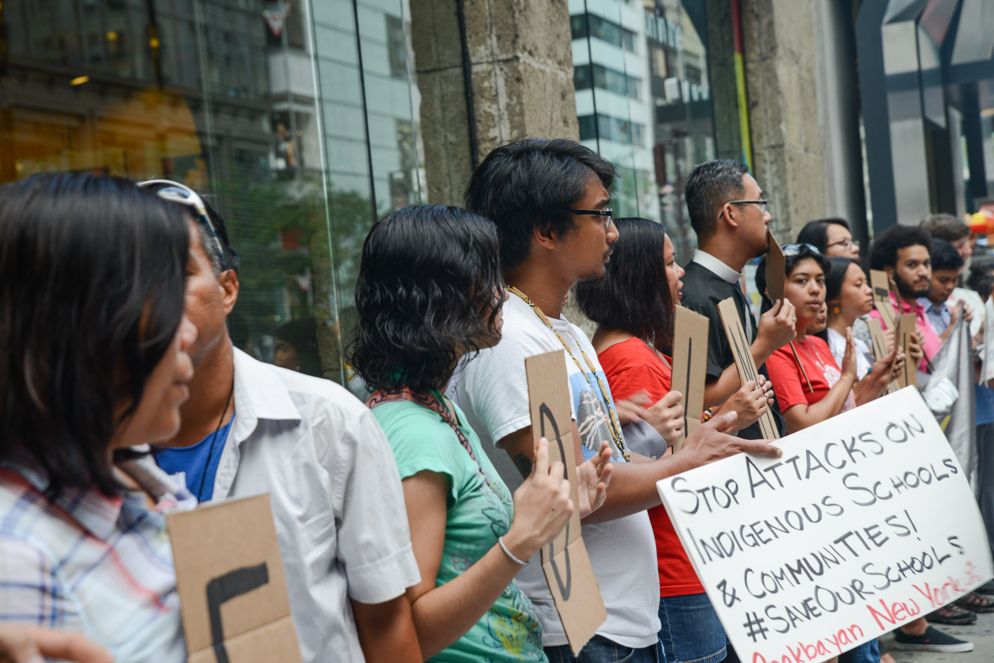 NEW YORK – On September 4, 2015, Bagong Alyansang Makabayan (BAYAN) USA Northeast, alongside the New York Committee for Human Rights in the Philippines (NYCHRP), GABRIELA New York, Anakbayan New York (ABNY), Anakbayan New Jersey (ABNJ), and solidarity allies protested inside and in front of the Philippine Consulate in condemnation of the extrajudicial killing of Lumad leaders Emerito Samarca, Dionel Campos, and Bello Sinzo. The mobilization was a part of a larger International Day of Action by BAYAN USA, Anakbayan USA, and the Save Our Schools Network in cities such as Toronto, Los Angeles, and Seattle.