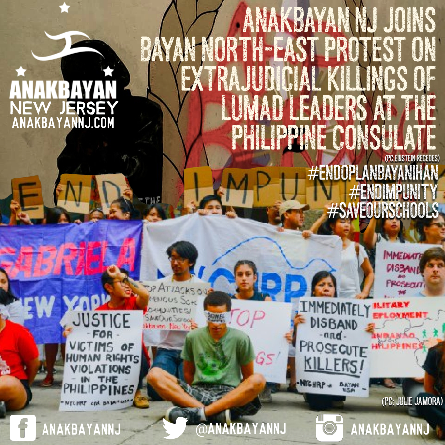 “Araw-araw na pinapatay, pinagmamalupitan, o ginagahasa ng mga paramilitary ang mga katutubong Lumad sa Mindanao,” said Ruthie Arroyo, Interim Vice Chairperson of Anakbayan New Jersey, “Sa kasamaang palad, ang walang awang pagpatay kay Tatay Emok, Dionel Campos at Bello Sinzo ay hindi lamang ang nagiisang kaso nang paglalabag sa karapatang panatao ng Lumad. Ang counterinsurgency program ng rehimeng Aquino o Oplan Bayanihan ay nagbibigay daan para hindi managot ang mga militar sa pagsusupil at pagsasakop ng lupain na pag-aari ng mga katutubo. Ilan pa bang kababayan natin ang kailangan pahirapan at patayin bago tayo magkaisa? Let us link arms and express our deep opposition to the numerous killings and occupation in Mindanao brought upon by Oplan Bayanihan! As Filipino-Americans, let us demand to put a stop to the $50 million U.S. military aid sent to the Philippines annually.”